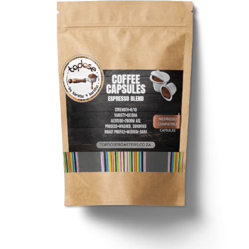 Boost your espresso game with Capsules Espresso Blend by Top Dose Roasters, Johannesburg-crafted Nespresso-compatible pods. Dark chocolate and nutty floral aroma in a medium-dark roast, strength 8/10.